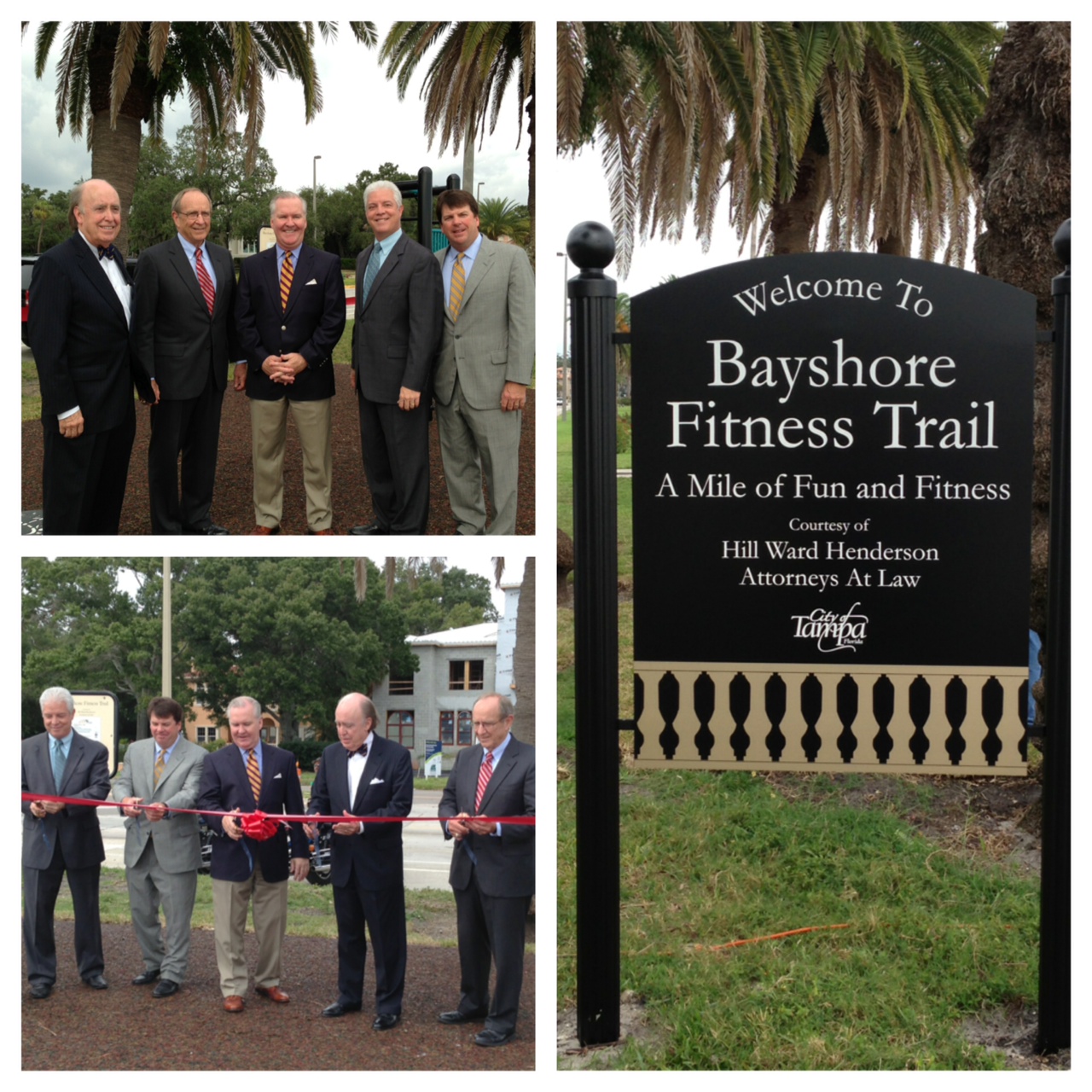 Hill Ward Henderson’s Chair, Benjamin H. Hill, III, Vice-Chair, Thomas N. Henderson, and Managing Shareholder, R. James “Jim” Robbins, Jr. joined with Mayor Bob Buckhorn to cut the ribbon on the new exercise equipment installed along Bayshore Fitness Trail. The event took place on Tuesday, November 12, 2013 at 1:30 p.m. at the southern end of the trail, located at the intersection of Rome and Bayshore.
