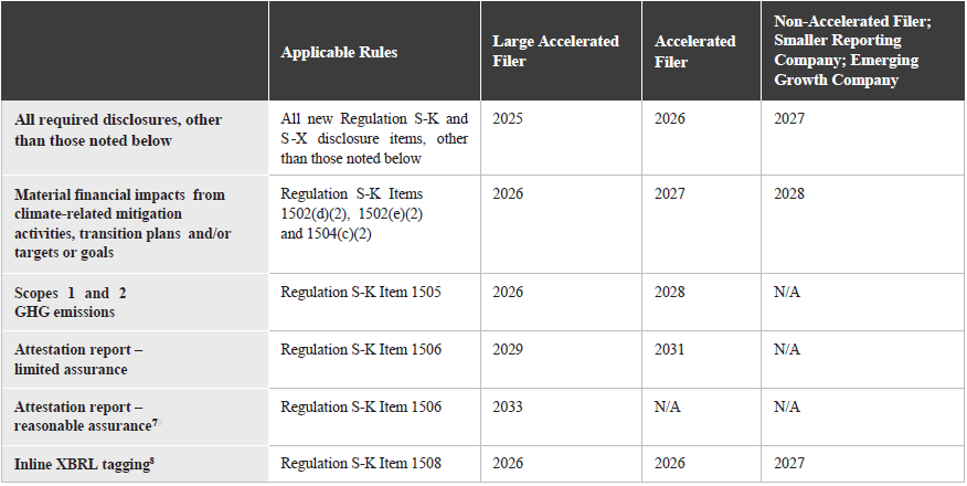 example, a large accelerated filer with a December 31 fiscal year end would be required to comply with the earliest disclosure requirements beginning with its annual report for fiscal year ending December 31, 2025 (filed in 2026).