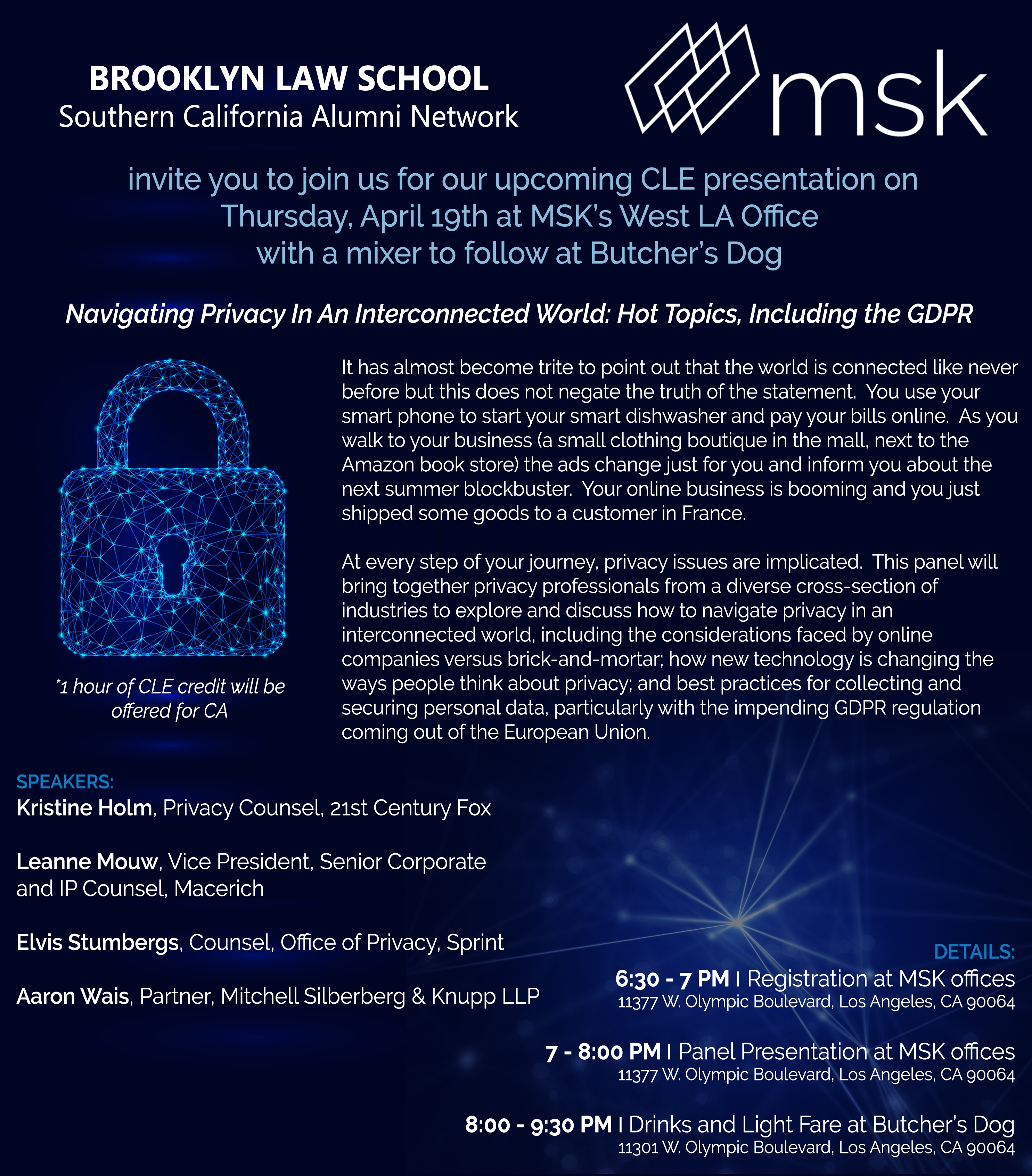 Aaron Wais will be speaking on the panel, "Navigating Privacy in an Interconnected World: Hot Topics, Including the GDPR," at a special co-sponsored CLE presentation with Brooklyn Law School Southern California Alumni Network on April 19th.